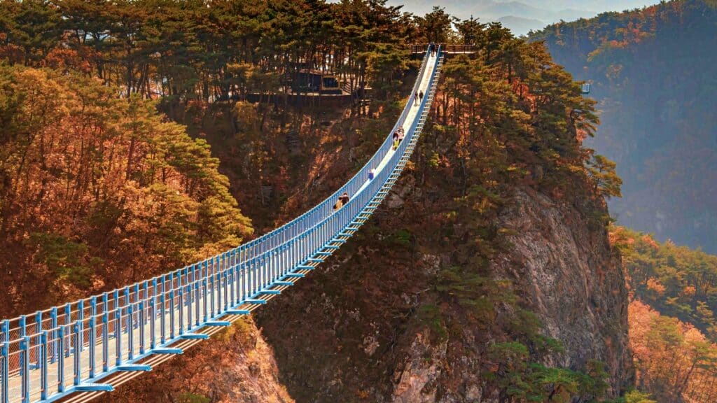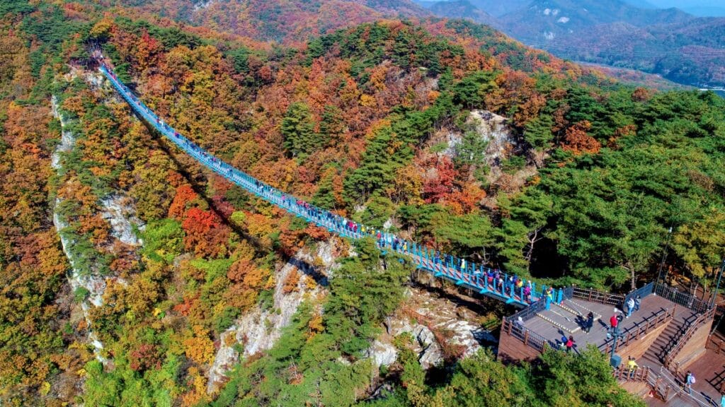길이 200미터, 높이 100미터의 다리 위에서 맞이하는 가을바람은 생각보다 조용하고 안정적이다. 다리 아래로 펼쳐진 계곡과 기암절벽, 뒤이어 연결되는 너른 숲길 데크는 겉보기에 위태로워 보이지만 실제로는 고르게 정비되어 있다.