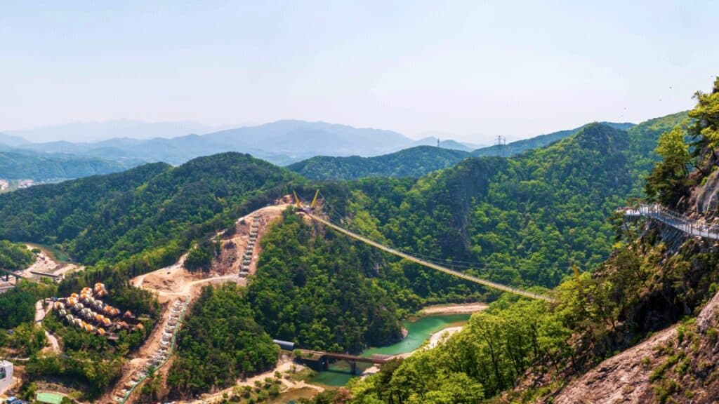 이 중 가장 먼저 체험하게 되는 핵심 시설은 출렁다리다. 이 다리는 길이 200미터, 높이 100미터, 폭 1.5미터 규모로 설계되어 있으며 체감 높이와 흔들림이 함께 작용하는 구조다.