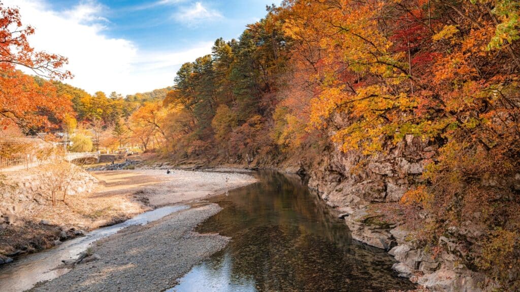 계곡 양옆으로는 빽빽한 숲과 절벽이 형성되어 있어 물길을 따라 걷는 것만으로도 깊은 산중에 들어온 듯한 몰입감을 준다.