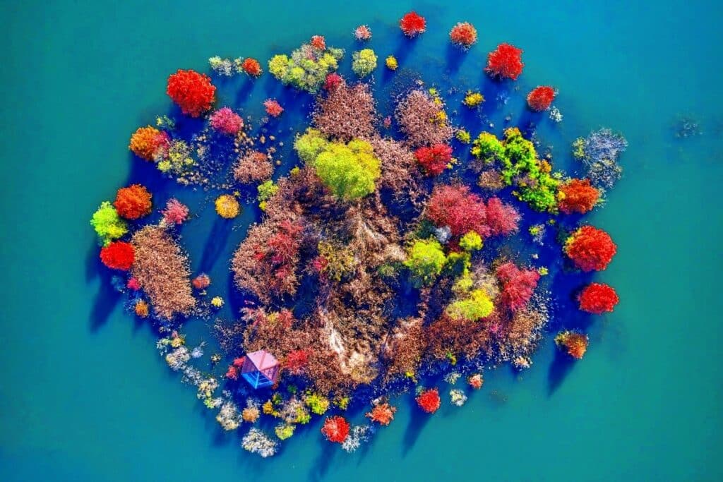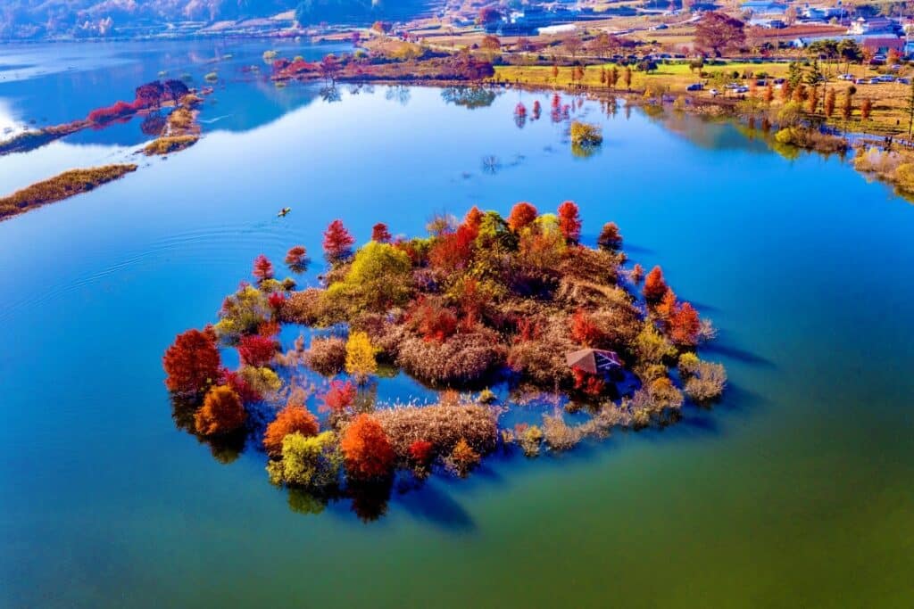 전북특별자치도 진안군에 위치한 용담호는 거대한 인공호수로, 진안의 산과 호수가 어우러져 만들어내는 가을 풍경이 일품이다.