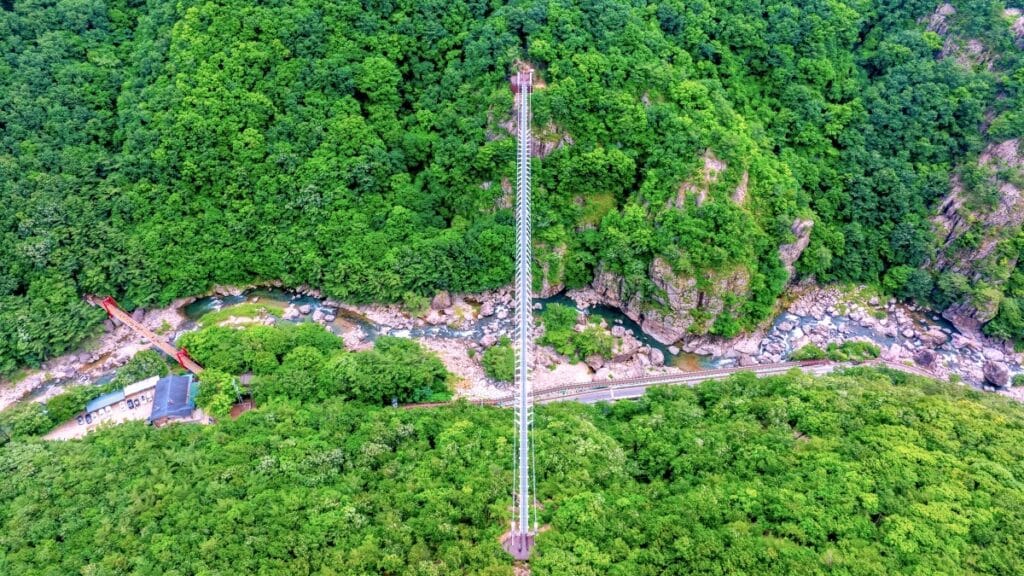 고개를 들면 온통 푸른 숲과 암벽이 시야를 감싸고, 고개를 숙이면 다리 아래로 흘러내리는 물줄기가 가늠할 수 없는 깊이를 드러낸다.