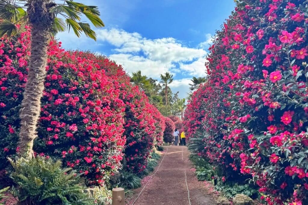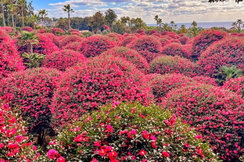 키가 6m 이상 자란 동백나무들이 둥글게 다듬어진 수형을 유지하고 있어, 일반적인 동백 명소와는 또 다른 독특한 풍경을 자아낸다.