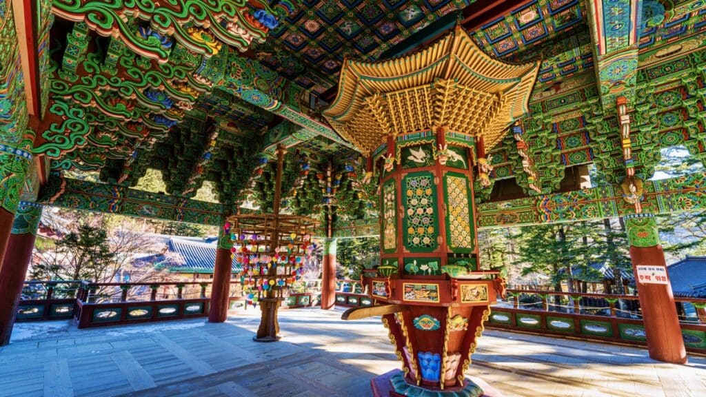 월정사의 상징은 팔각구층석탑이다. 고려 시대를 대표하는 화려하고 장엄한 다층 석탑으로 국보로 지정돼 있으며, 탑 앞에는 공양하는 모습의 석조보살좌상이 마주하고 있어 사찰의 중심 풍경을 완성한다.