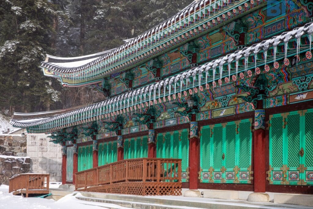 경내의 대표 전각인 적광전은 석가모니불을 모신 본전으로, 화려한 단청과 장엄한 규모가 특징이다. 설경 속에서 단청의 색감이 더욱 선명하게 대비되며 겨울 산사 특유의 단정한 아름다움을 보여준다.