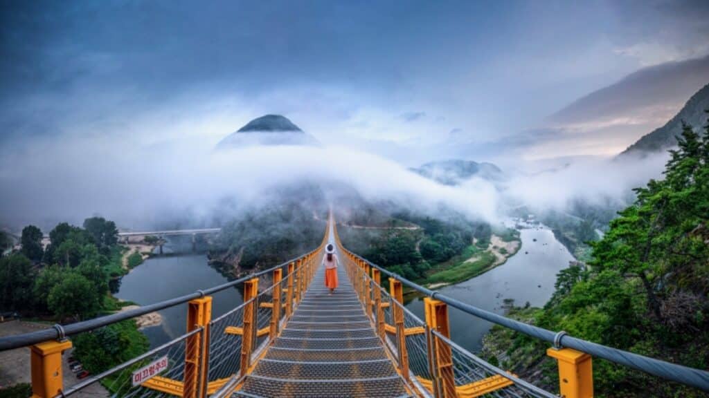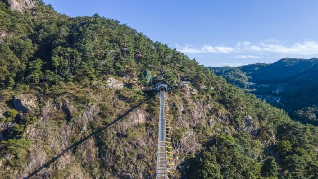 고요한 자연 속에 우뚝 선 이 다리는 단순한 관광지를 넘어선 감각의 공간이다. 주탑 없이 설계돼 바람결에도 흔들리는 구조는 걷는 이의 용기를 시험한다.