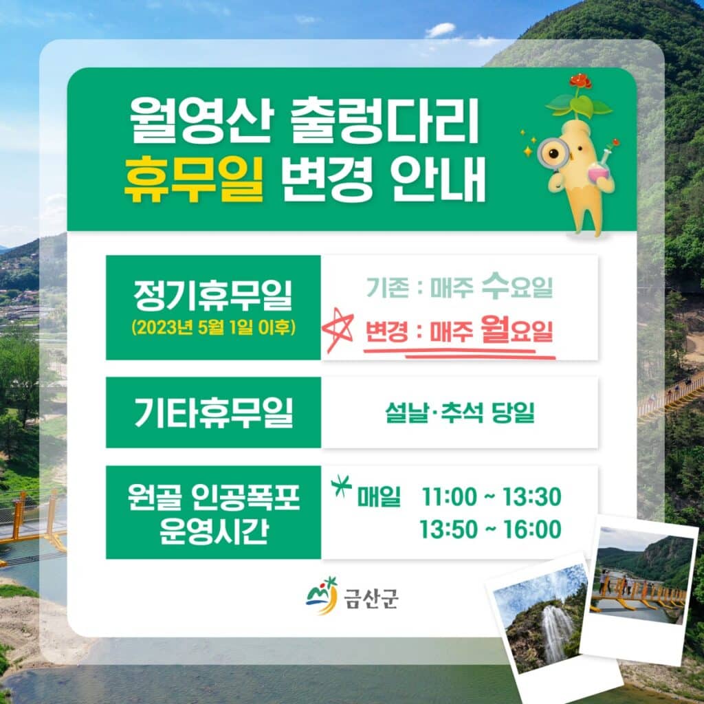 충청남도 금산군 제원면 천내리 241-8에 위치한 ‘월영산 출렁다리’는 2022년 4월 28일 개통된 비교적 새로운 시설이다. 높이 45미터, 길이 275미터, 폭 1.5미터의 규모로, 주탑 없이 설계된 무주탑 구조가 특징이다.