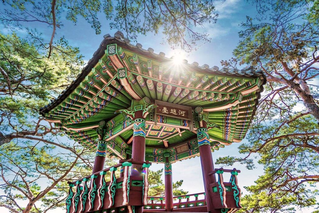 깎아지른 절벽 위에 세워진 정자에서 아래를 내려다보면 수백 년 자리를 지킨 노송과 바위섬, 파도에 깎인 암석들이 시야에 들어온다.