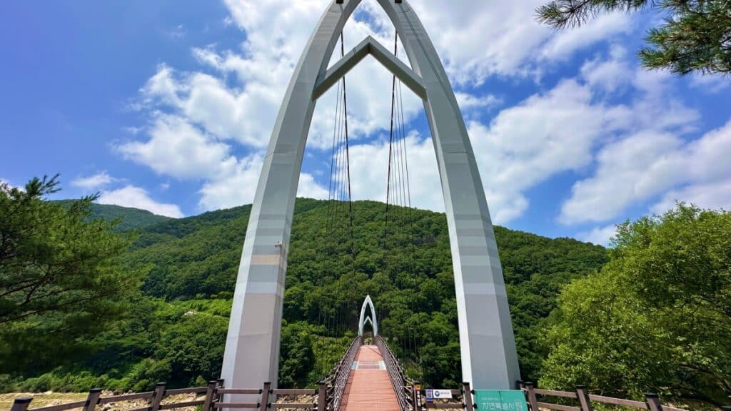 충청북도 괴산군 칠성면 사은리 산 5-1 일원에 위치한 ‘연하협구름다리’는 괴산호 위를 가로지르는 길이 167미터, 폭 2.1미터의 무주탑 현수교 형식 출렁다리다.