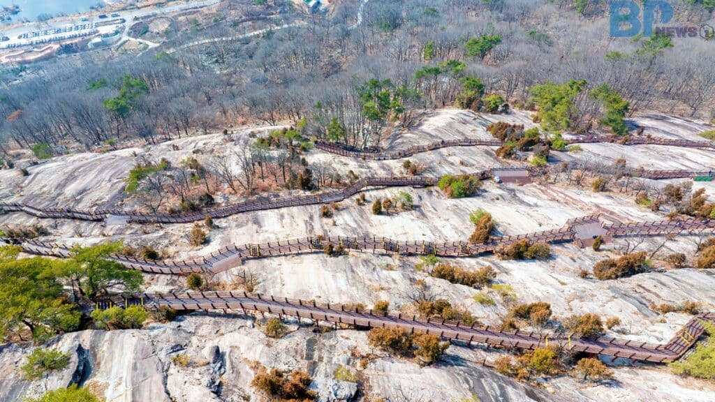 그렇지만 전체 동선의 난도는 높지 않다. 경사도 완만하게 설계돼 있고, 중간중간 데크 쉼터와 비룡정자 같은 휴식 공간이 마련돼 있어 걷다 쉬기를 반복하며 여유롭게 오를 수 있다.