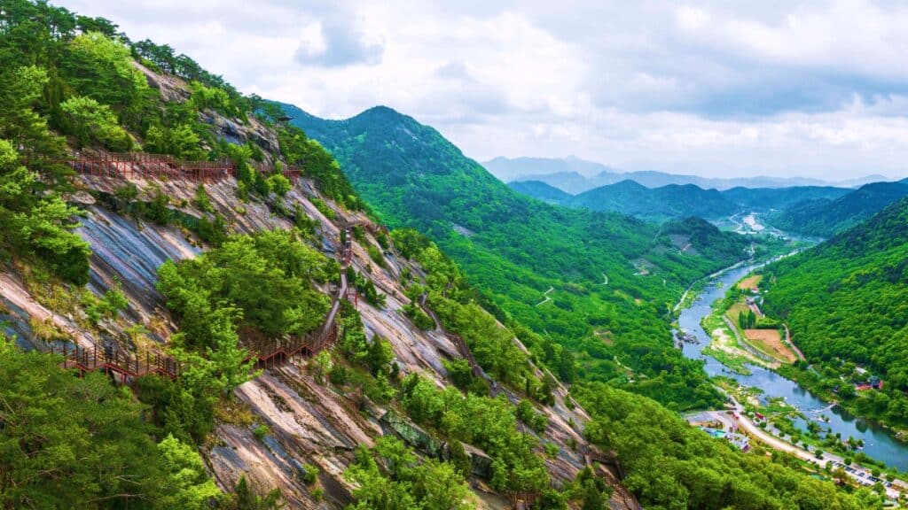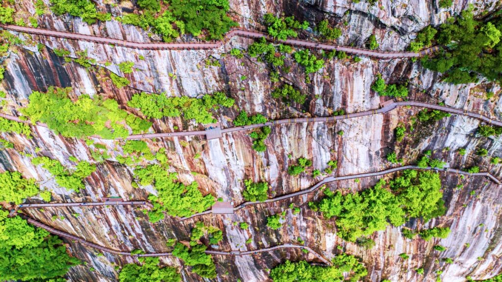 바닥이 투시형으로 설계된 일부 구간은 발아래 절벽과 강줄기가 그대로 내려다보이는 형태로 구성돼 있어, 평지 위 산책로와는 전혀 다른 몰입감을 제공한다.